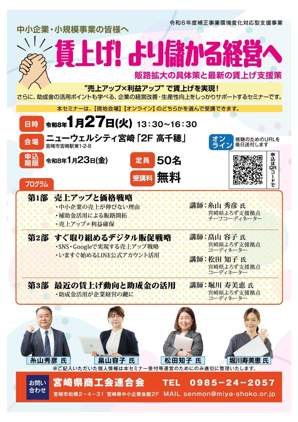 宮崎県商工会連合会は、県内の中小企業・小規模事業者を対象に、販路拡大の具体策と最新の賃上げ支援策を解説するセミナー「賃上げ!より儲かる経営へセミナー」を、令和8年1月27日(火)に開催いたします。