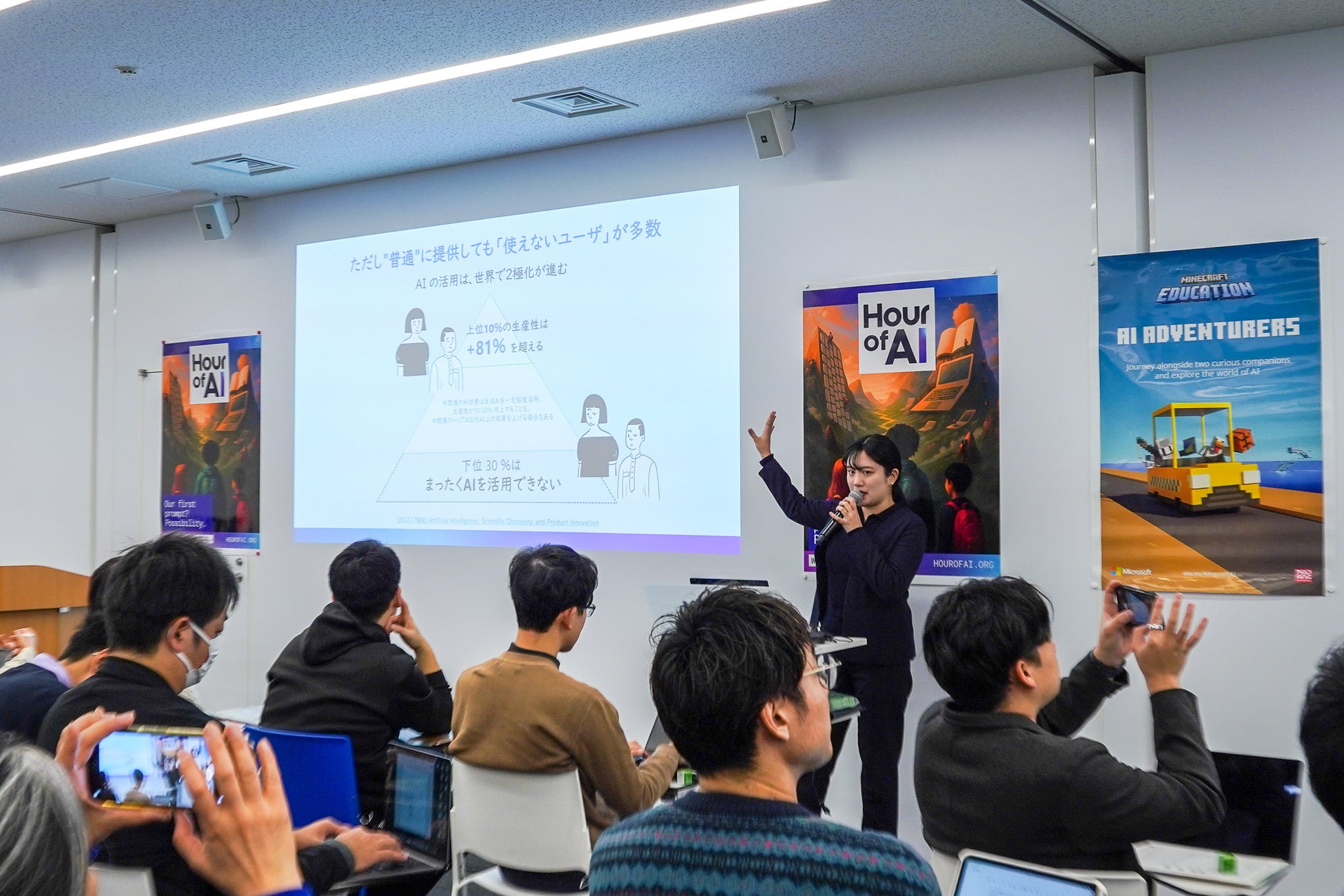 当日は、日本マイクロソフトのボランティアが、教育分野で急速に広がる生成AIの最新動向について分かりやすく解説しました。また、教室ですぐに活用できる包括的なHour of AI教材も紹介。セッション中は、質疑応答やディスカッション、ふりかえりを通じて参加者を丁寧にサポートし、構造的で充実した学びの場を提供しました。