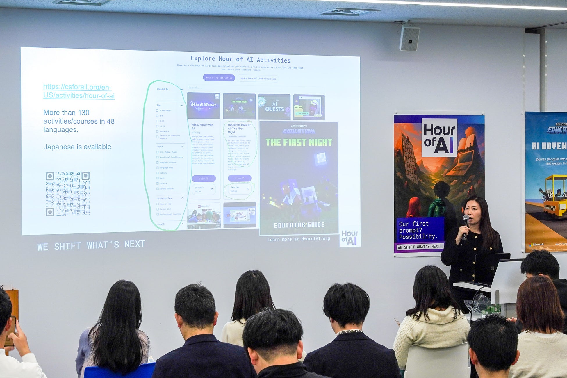 今回のHour of AIは、NPO法人デジタルものづくり協議会と日本マイクロソフトの共催により、教育関係者向けに開催されました。参加者は、授業や学習、教室内のコミュニケーションをより魅力的で効率的、そして楽しいものにするAIツールを体験しました。また、教室ですぐに活用できる100以上のHour of AI教材にもアクセスし、生徒のAIリテラシーを育む具体的な方法を学びました。本日参加した教育関係者は、学んだスキルや教材を学校へ持ち帰り、AIに対応した学びの機会を生徒へ提供していく予定です。