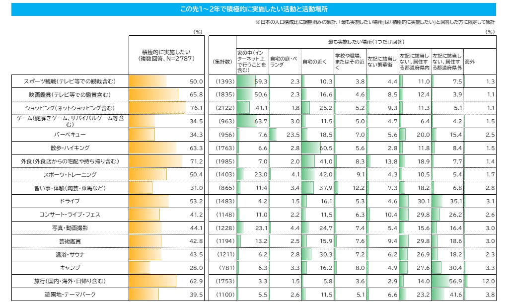 表2は今後実施したい活動と活動場所です。「ドライブ」は表1の「この1年で実施した場所(複数回答)」では「居住する都道府県内」が最も多かったところ、今後実施したい場所(1つだけ選択)では「居住する都道府県外」が高い結果となっています。また、「旅行」では「海外」が12.0%となりました。