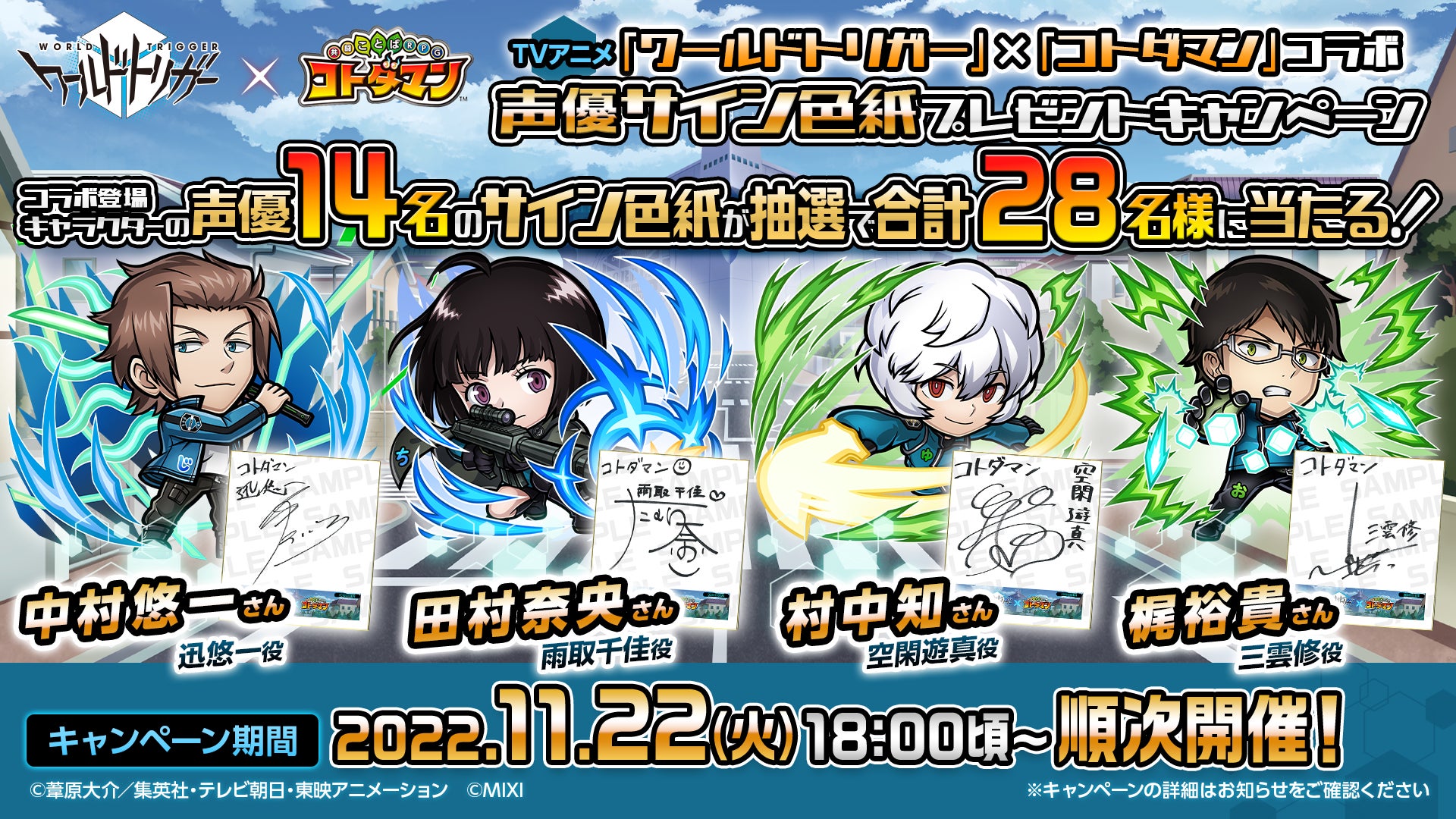 また、コラボ開催を記念して、本日11月22日(火)よりコラボ記念スペシャルPVの公開をはじめ、TVアニメ「ワールドトリガー」×「コトダマン」コラボに出演する村中知さん(空閑遊真役)、梶裕貴さん(三雲修役)、田村奈央さん(雨取千佳役)、中村悠一さん(迅悠一役)など、声優総勢14名のサイン色紙が当たるTwitterキャンペーンや、コラボイラストを使用した「コラボ特製つながるブロマイド」が当たるTwitterキャンペーンを開催します。