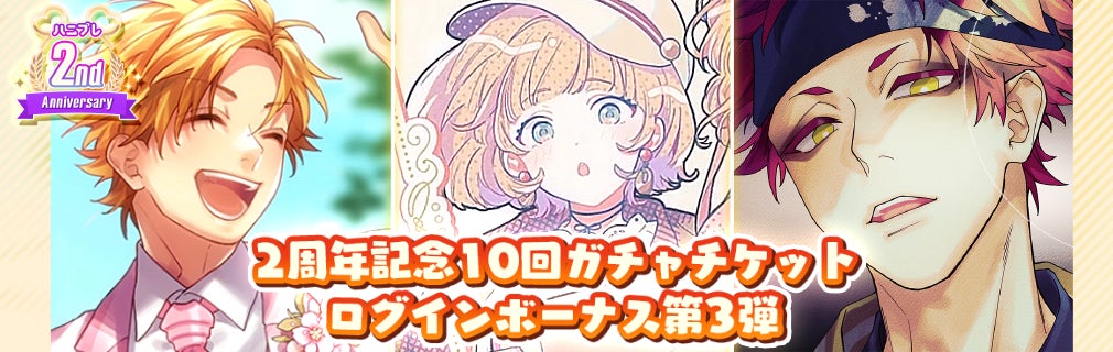 第1弾に引き続き、ハニプレオープン2周年を記念して「2nd Anniversary記念10回チケットガチャ」で使用できるガチャチケットが貰える「2nd Anniversary10回ガチャチケットログインボーナス第3弾」を開催いたします。