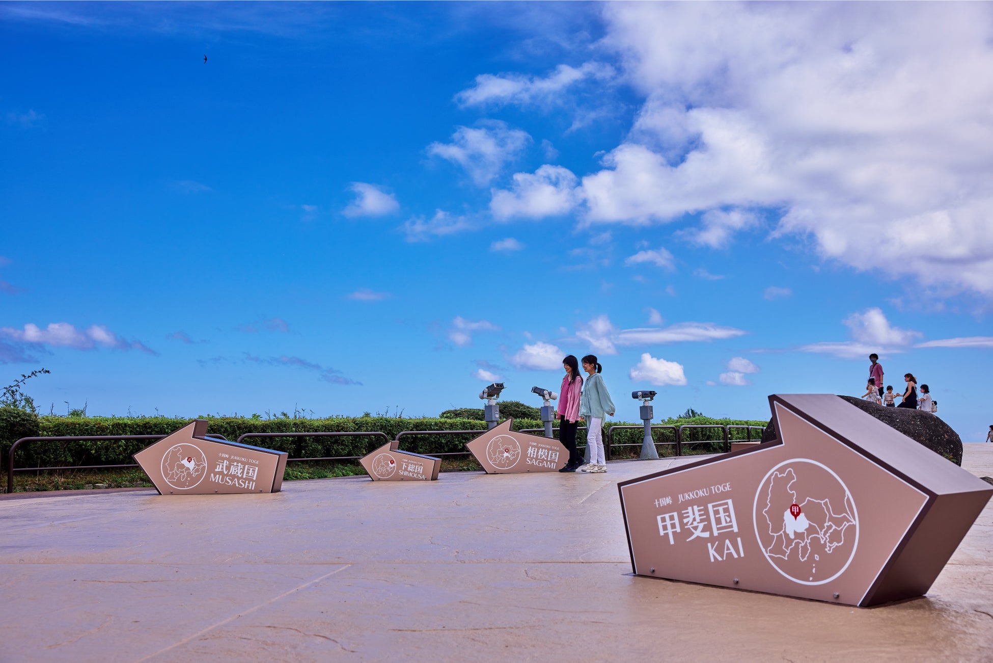 富士山をはじめ山々を一望できるデッキや、寝転びながら駿河湾や初島の景色を楽しめるハンモック付のデッキなど、十国峠山頂広場を囲むように設置された様々な形状のデッキから、目の前に広がる360°パノラマをお楽しみいただける展望テラスです。十国峠の文字を象った巨大モニュメント、“十の国”を指す矢印モニュメントなど、多数のフォトスポットがあります。