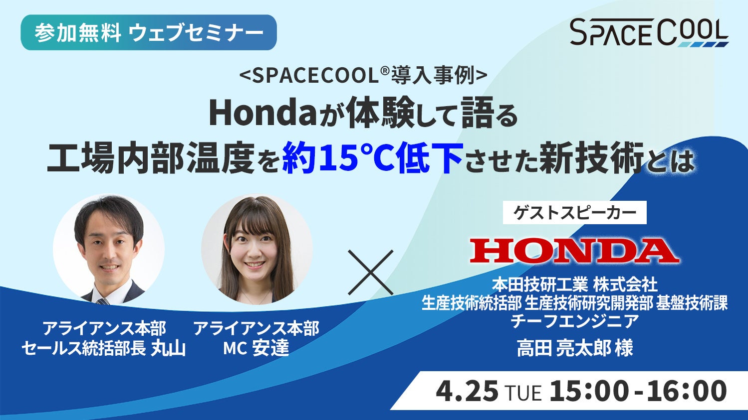SPACECOOL 株式会社(代表取締役社長:宝珠山 卓志)は、自社工場設備へ実際に施工し、実証実験にもご協力いただいた本田技研工業株式会社様をお招きして、建物屋根・コンテナへの施工に関する疑問解消、脱炭素社会における省エネ対策をご紹介するウェビナーを4月25日(火)に開催します。