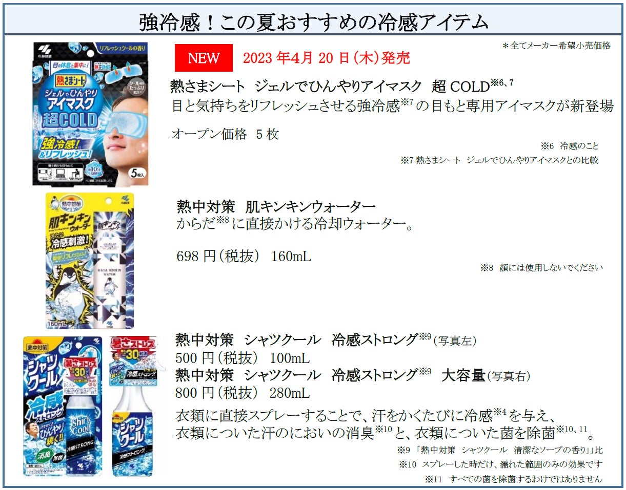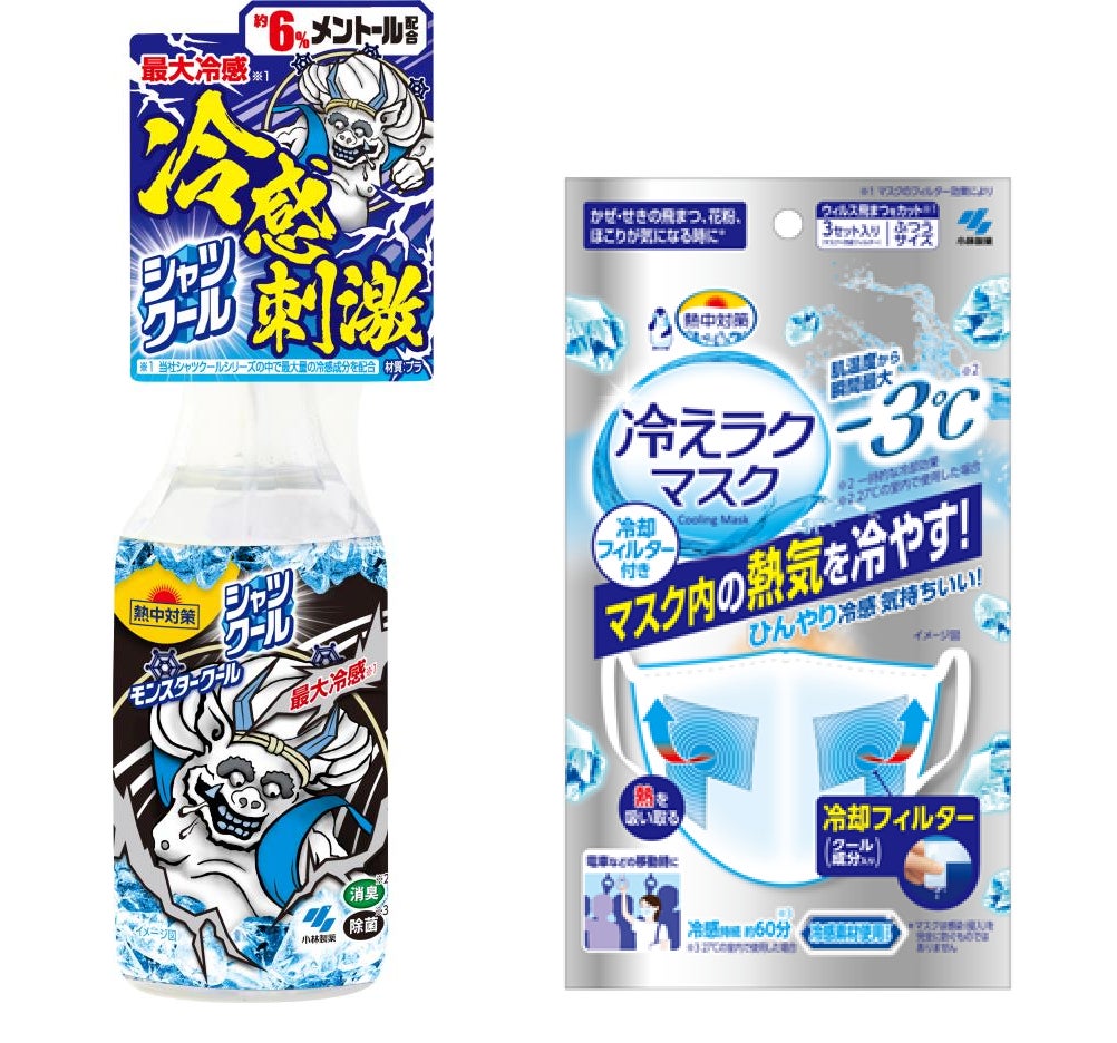 小林製薬株式会社(本社:大阪市、社長:小林 章浩)は、衣類用冷感ミストの『シャツクール』 シリーズ史上、最大の冷感を実現した「熱中対策 シャツクール モンスタークール」を3月より発売しております。また、冷却フィルターでマスク内の熱気と肌を冷やす「熱中対策 冷えラクマスク」を 6月8日(木)より新発売いたします。