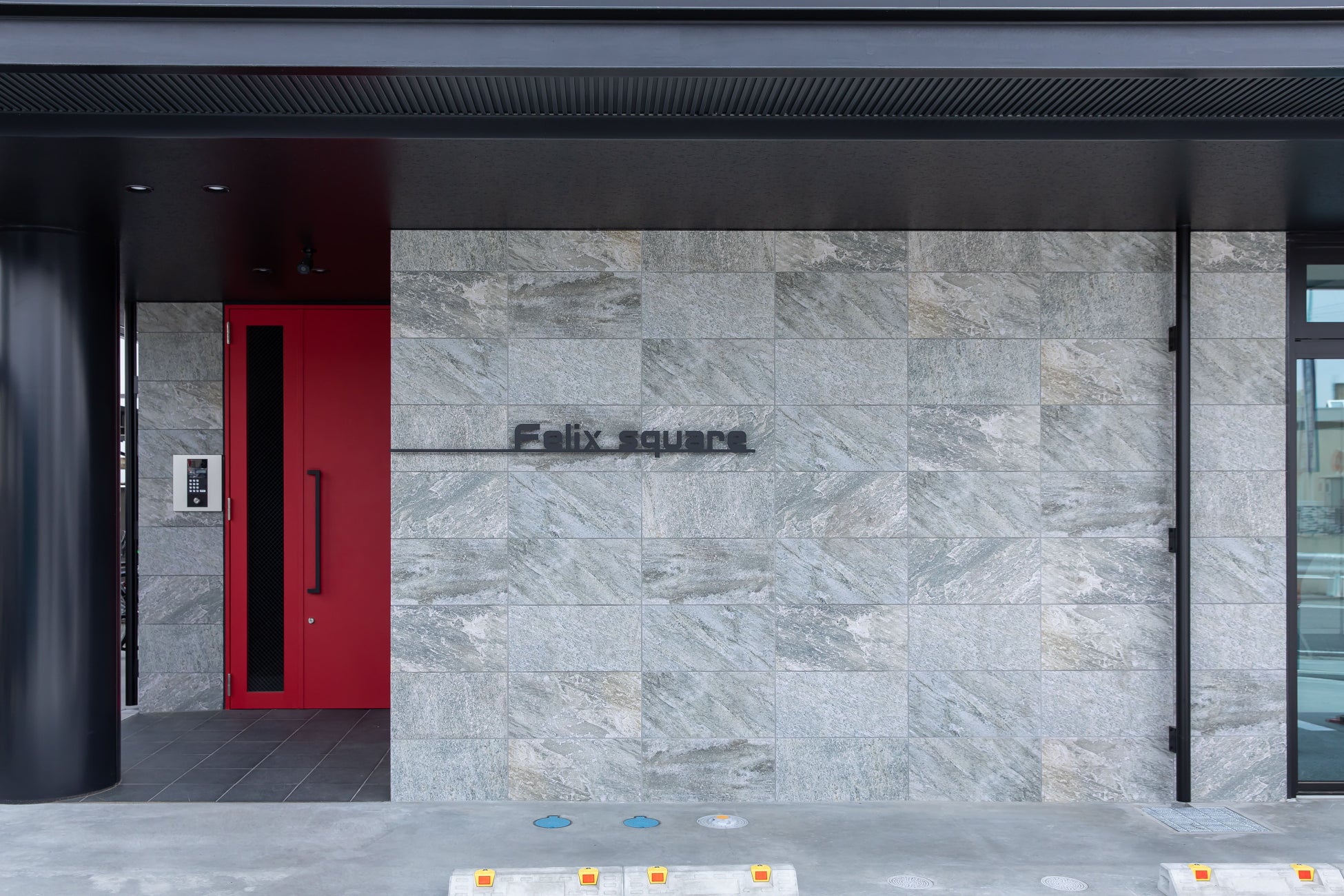 アパートを併設していることもあり、オフィスの外観は、愛知県で展開しているフィリックスアパートと統一したブランディングをイメージ。アパートにつながる入口にはアパート名である“Felix square”の看板を配置しております。