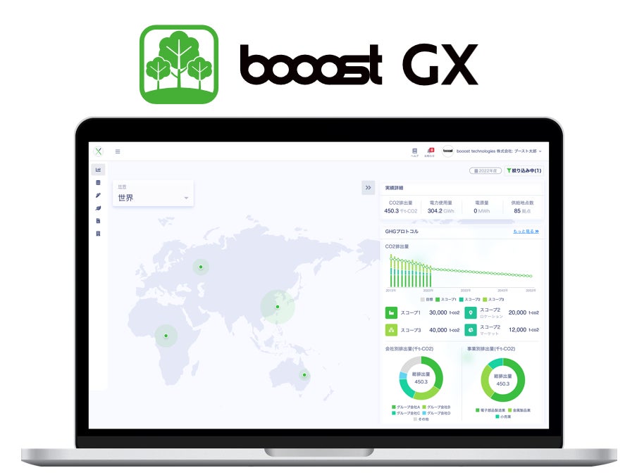 「booost Sustainability Cloud」のアプリケーションの一つで、CO2排出量の見える化・カーボンオフセット・報告レポート等のGX(グリーン・トランスフォーメーション)を促進する「booost GX」は、各業界のNET-ZEROリーダーから選ばれ、累計12万拠点以上に採択されています。製品・サービスごとの排出量が可視化でき、計画に沿ったCO2の削減(省エネ、再エネ、非化石証書の購入等)を実行できます。さらに、国際イニシアティブ(RE100、SBTi、TCFD等)や温対法等の各種報告レポートを自動で作成。効率的な脱炭素経営をサポートします。