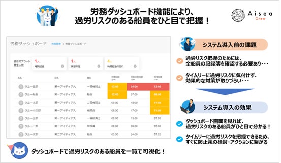 2つ目は過重労働リスクが発生した場合、アラートにより陸上管理者がタイムリーにリスクを把握することができ、速やかに過労防止措置を取ることができるようになりました。システム導入前は、各船員の過重労働リスクを把握するためには全船員の労務状況を個別に確認する必要がありましたが、Aisea Crewの陸上管理者向けWebシステムの大きな特徴である「労務ダッシュボード機能」により、一覧画面で過重労働の恐れのある船員をアラートでタイムリーに確認することが可能となり、過重労働防止措置の高度化へと繋がりました。