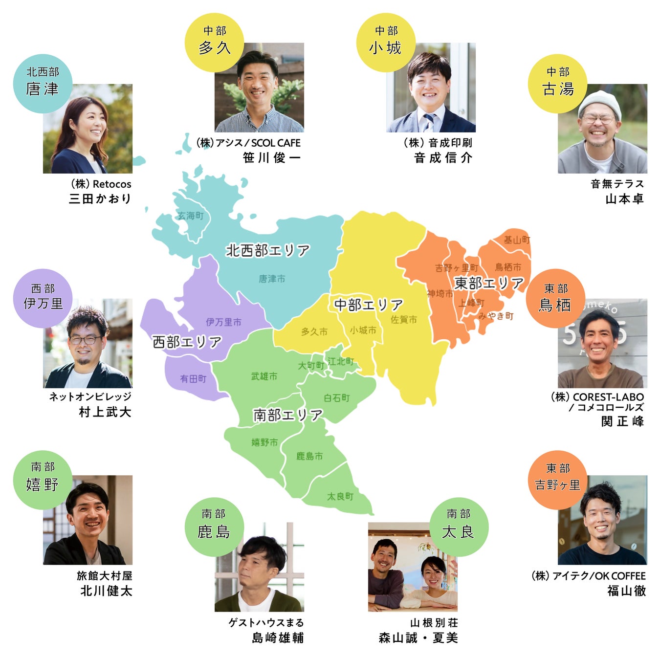佐賀県の5つのエリアで事業を展開する10組のサポーター達が移住起業希望者のチャレンジを後押しします。いずれも佐賀が誇る様々な経歴のトップランナー達です。