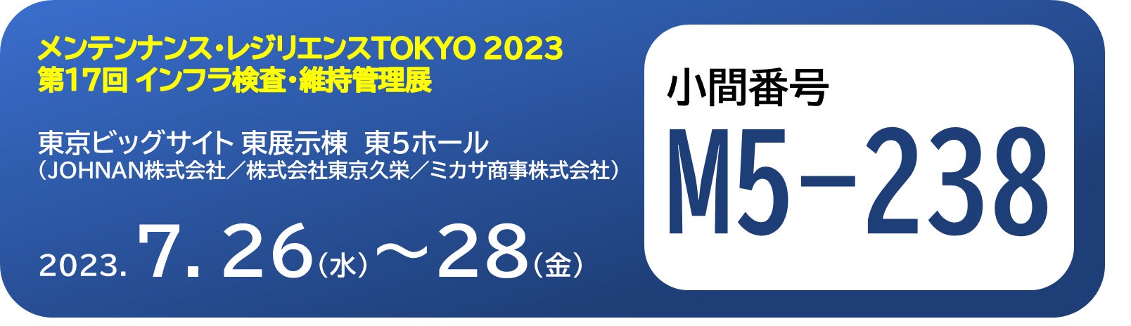 ROV MOGOOLシリーズの販売を行う JOHNAN株式会社(京都府宇治市:代表取締役社長兼CEO 山本 光世)は、取放水設備の設計・施工、環境コンサルタントや水中メンテナンスを行う株式会社東京久栄(東京都千代田区:代表取締役社長 髙月 邦夫)、ROV MOGOOLシリーズ及びHy-CaTの販売店であるミカサ商事株式会社(大阪府大阪市:代表取締役社長 中西 日出喜)と2023年7⽉26⽇(⽔)〜28⽇(金)に開催されるメンテナンス・レジリエンスTOKYO2023に出展します。