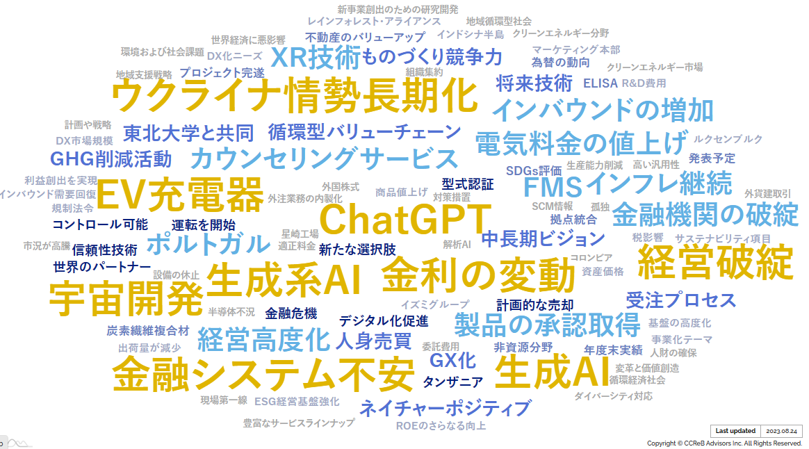 2023年8月29日(火)、CRE 戦略支援等を行うククレブ・アドバイザーズ株式会社(本社:東京都千代田区、代表取締役:宮寺之裕、 以下「当社」)は2023年8月までに公表されたすべての上場企業が提出する「有価証券報告書(以下「有報」)」内、第2【事業の状況】1【経営方針、経営環境及び対処すべき課題等】のページについて、自社独自のワード辞書と解析エンジンを利用して、2023年にTOP100にラインクインしたワード※から現時点(2023年8月28日時点)における経営ホットワード(以下「初登場ワード」)に関するレポートを公表しました。