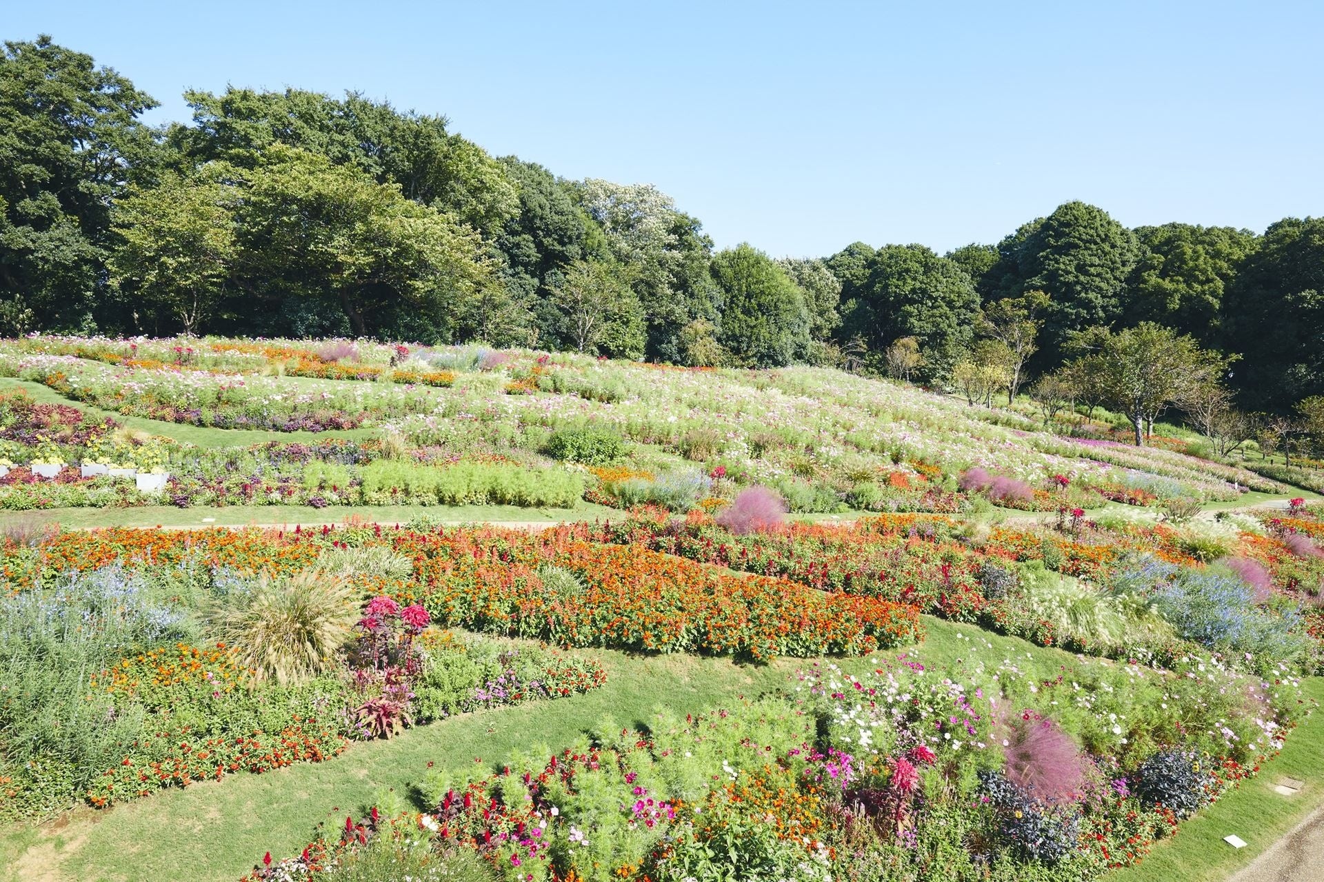 今秋は、『躍動の丘』をテーマに、浮世絵や着物の柄をイメージして、橙色や紫色など日本の伝統的な色彩を取り込み、華麗にしてダイナミックな色の組合せの花々で躍動感を表現しています。会場の9割以上の花苗が横浜市内産で、ジニア(ヒャクニチソウ)、サルビア、コスモス、センニチコウなど、約100品種20万本の多種多様な花々による花壇をお楽しみください。