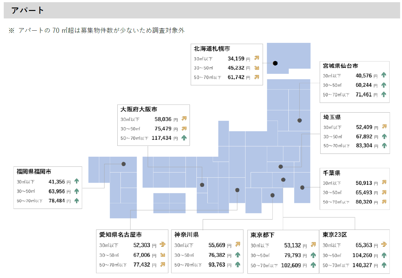 マンションの平均募集家賃は、東京23区・東京都下・埼玉県・名古屋市・大阪市・福岡市の6エリアが全面積帯で前年同月を上回る。