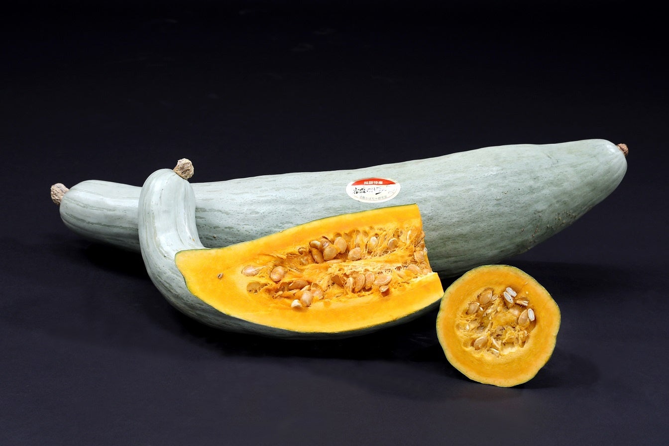 標高500メートルを超える盆地、昼夜の寒暖差が大きい気候、乗鞍山麓の湧水が育む肥沃な大地の下で育てられます。ヘチマのような独特の形状と灰緑色で縦縞のある表皮は、普段、スーパーなどで目にするかぼちゃのイメージとは大きくかけ離れていますが、その見た目からは想像できないようなホクホクとした食感と上品な甘みがあり、料理はもちろんスイーツなどにも使用されています。