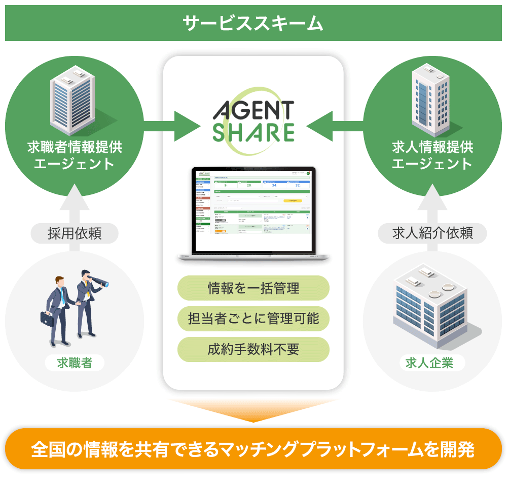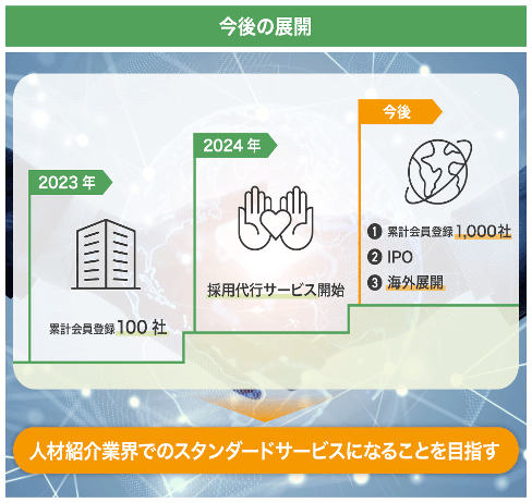 また、プラットフォームで構築されたエージェントのネットワークを活用し、求人企業の「採用代行サービス」も実現するとともに、海外エージェントとも連携しながらグローバルに「AGENT SHARE」を展開していくことで企業として成長してまいります。