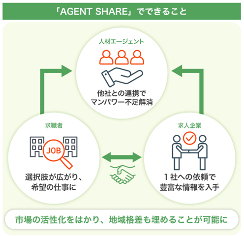 エージェントシェアの強みは、「AGENT SHARE」によって、市場全体で求人・求職者情報を共有することで市場の活性化につながることです。人材エージェントにとっては、業務効率化と求人・求職者の紹介精度の向上を図ることができ、成約率の向上も期待できます。また、本システムは人材エージェント向けですが、求職者と求人企業にとってもメリットがあると考えています。求職者にとっては、人材エージェント側の情報量が増えることにより就職・転職先の選択肢が増え、より質の高いマッチングを受けることができます。求人企業にとっては、人材エージェント1社に依頼するだけで採用活動を円滑に行えるため、業務の手間を減らすことができます。