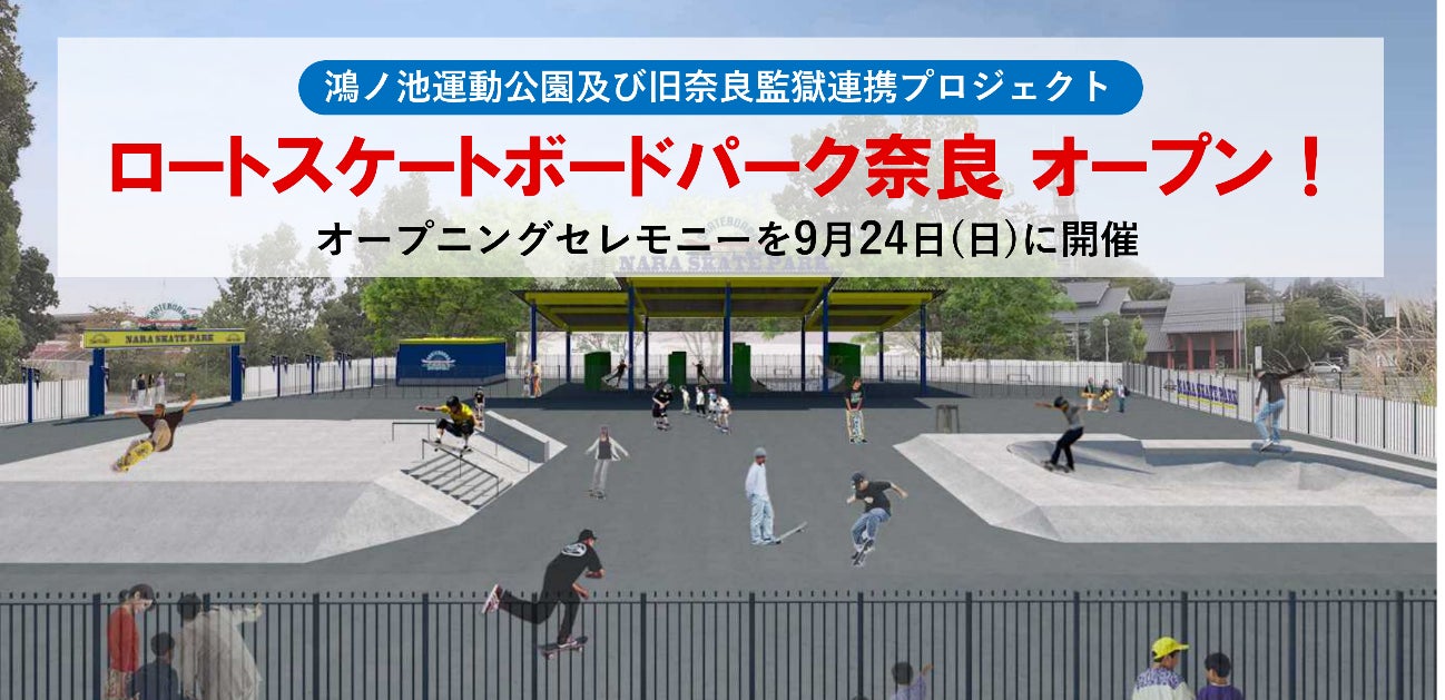 新しい奈良のイメージとして、ロート奈良鴻ノ池パークに、よりアクティブに楽しめるエリアを生み出すプロジェクト「鴻ノ池運動公園及び旧奈良監獄連携プロジェクト」の一環として整備を進めている“ロートスケートボードパーク奈良”が9月24日にいよいよオープンします。