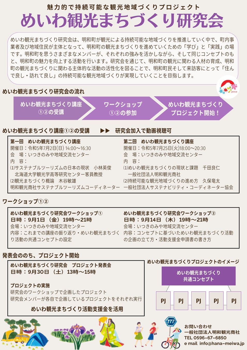 めいわ観光まちづくり研究会は、町内事業者及び地域住民が主体となって、明和町の観光まちづくりを進めていくための「学び」と「実践」の場です。
