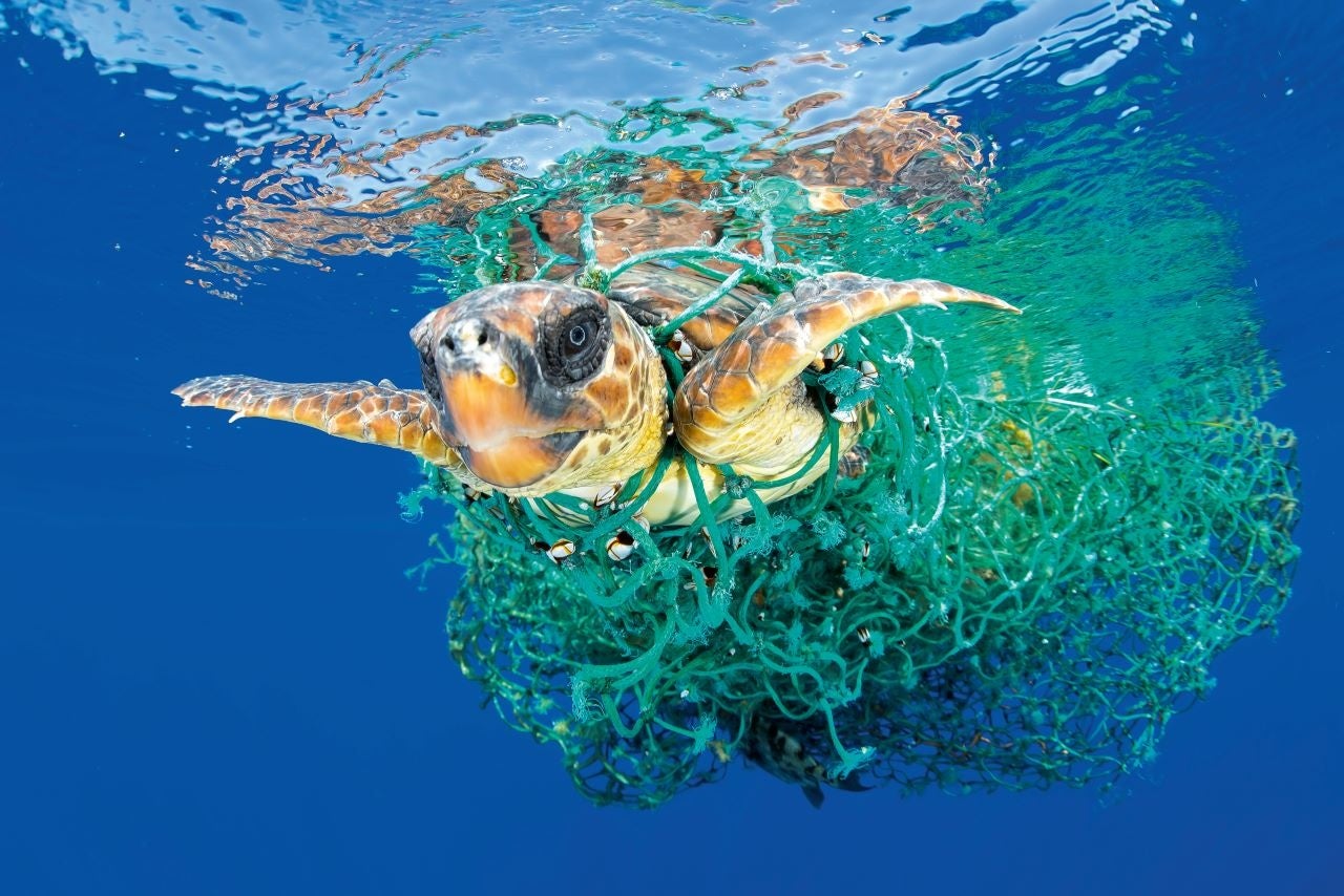 海洋プラスチックごみの問題は深刻です。例えば、ハワイとカリフォルニアの間で漂う「太平洋ゴミパッチ」はドイツの4.5倍の面積があり、その46パーセントは量の途中で失われたり、捨てられたりした漁網だといわれます。それらの網は無駄になっているだけでなく、漂流中に海洋生物を捕らえて死に至らしめることもあります。年間数百万トンの漁網が海に放出され、その廃漁網は4~500年漂流を続けるという専門家もいます。