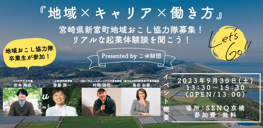 こゆ財団や新富町では、数多ある地域課題をチャンスと捉え、持続可能なビジネスで解決を図ることに前向きに取り組む意志がある人材と一緒に持続可能な地域づくりを目指しチャレンジしていきます。