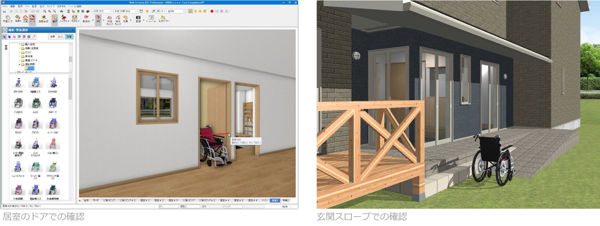 「Walk in home」は実際の⼨法に基づいて3D上でビジュアルの確認ができます。ドアを開けた状態で⾞椅⼦が実際に通れるかどうか、普段の動線で不都合が無いかなど、2Dではなく3D上でわかりやすく確認ができます。