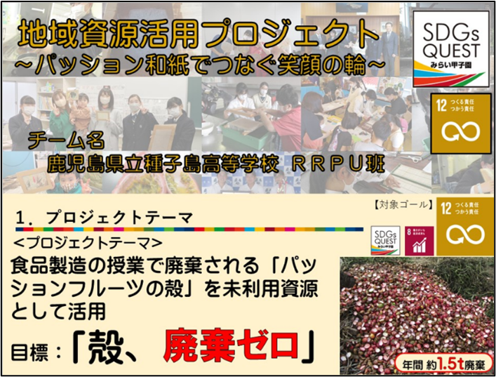 グランプリに輝いたチームは、試行錯誤を繰り返しながらも廃棄されたパッションフルーツ殻から和紙を作る事に成功し、商品化した地域循環事業のSDGsアクションプランです。