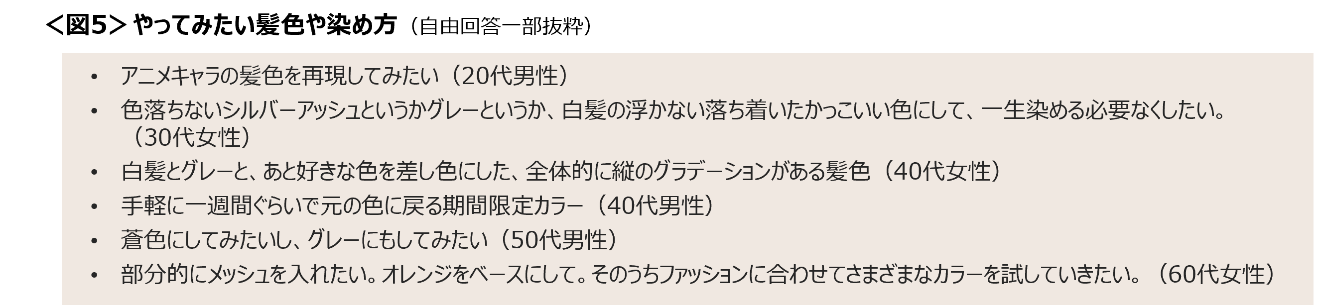 やってみたいカラーリングは、メッシュやグラデーション、色落ちしても気にならない色、手軽に元に戻せるものなどがあがった。<図5>