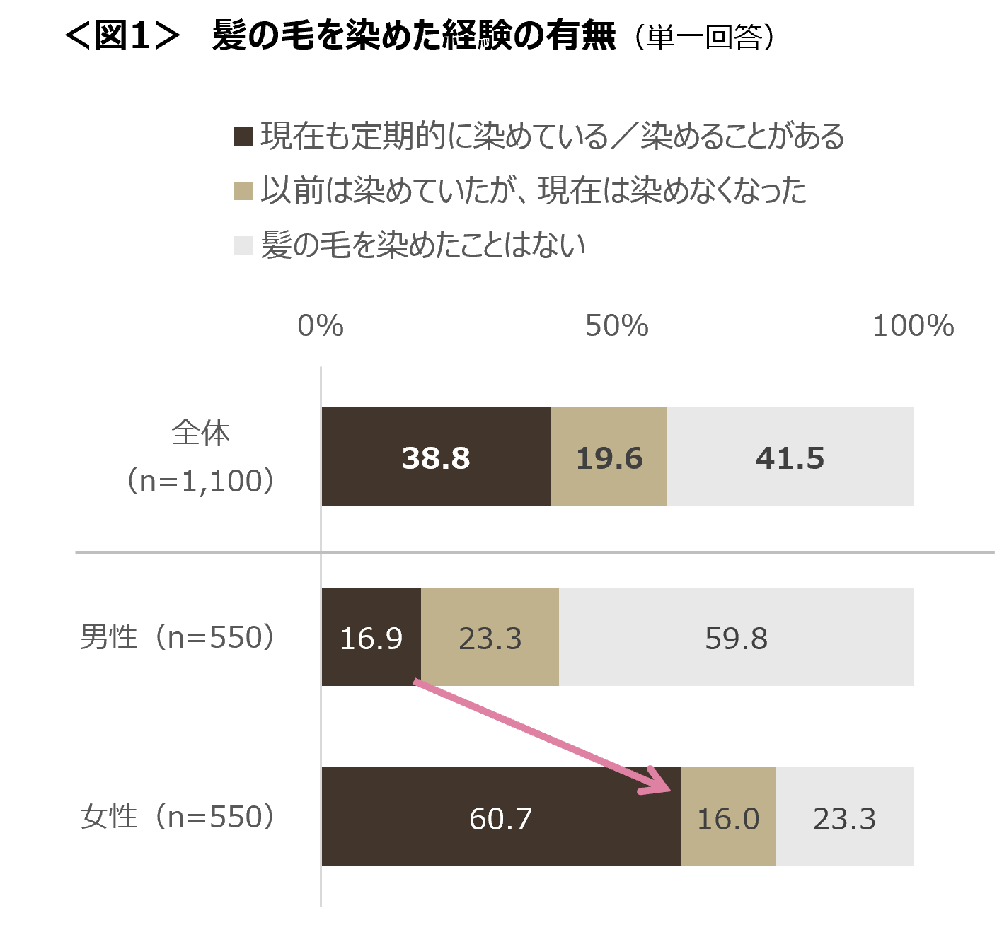 「現在も定期的に染めている/染めることがある」人は男性では16.9%と2割を下回り、性別により大きな差がみられる。