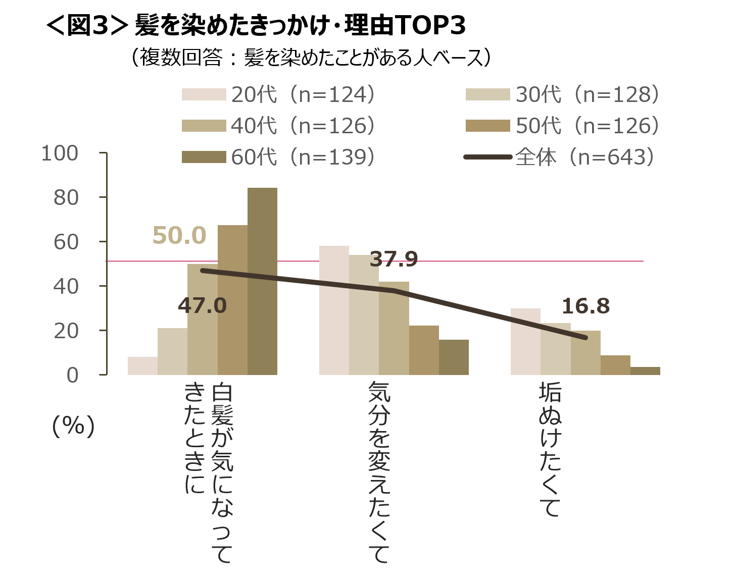 髪を染めたきっかけとしては、「白髪が気になってきたときに」が47.0%でTOP。20代~30代では気分を変えたいときや垢ぬけたいときに髪を染める人が目立つ。<図3>