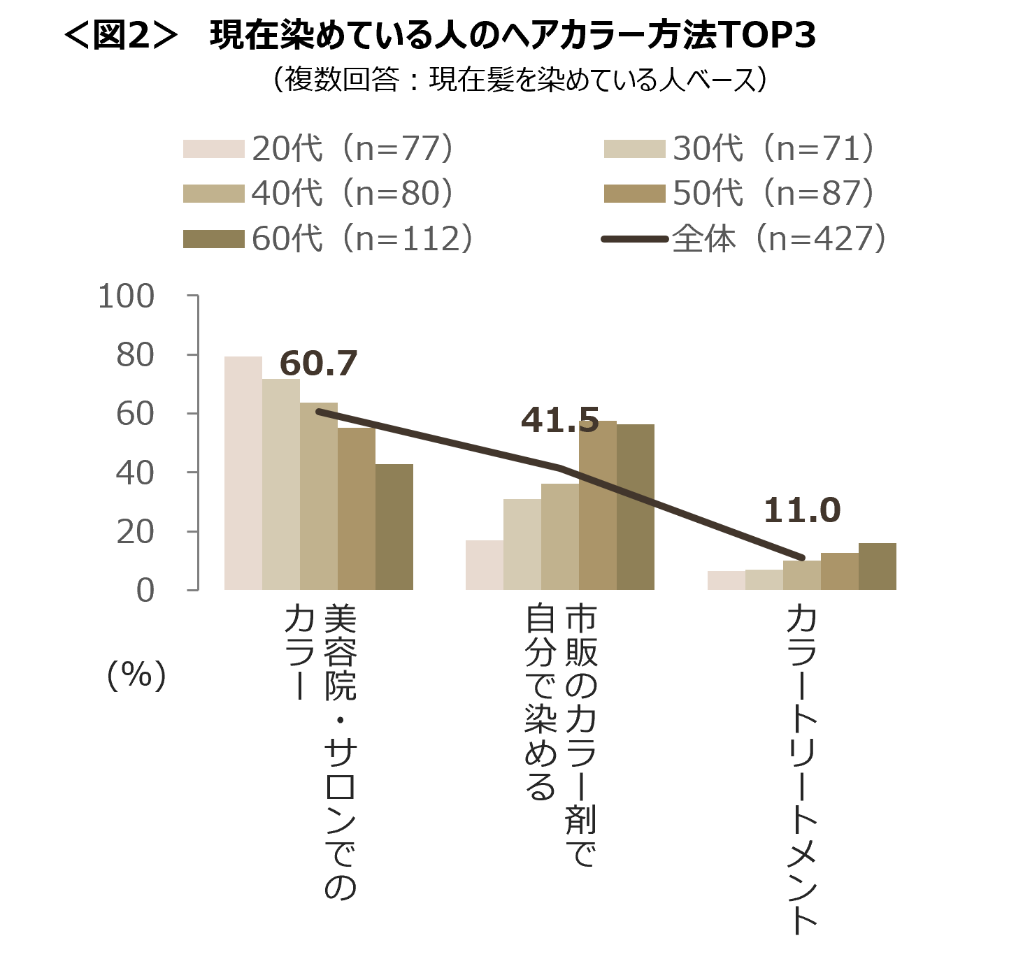 現在髪を染めている/染めることがある人は約4割。女性では6割を占める。若年層ほど美容院・サロンで、年代が上がると市販のカラー剤で染める人の割合が高くなる。<図1・2>