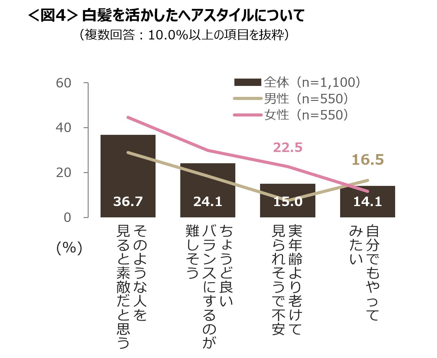 白髪を活かしたヘアスタイルの印象について「そのような人を見ると素敵だと思う」が36.7%で最も多い。<図4>