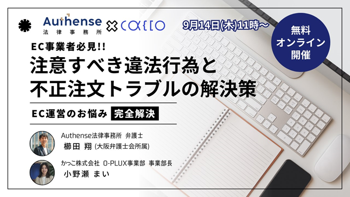 安全なネット通販のインフラづくりに貢献するかっこ株式会社(本社:東京都港区、代表取締役社長CEO : 岩井裕之、証券コード:4166、以下 かっこ)は、幅広い業界での相談や実績豊富な弁護士法人Authense法律事務所(本社:東京都港区、代表弁護士:元榮太一郎、以下Authense法律事務所)と共催で、9月14日(木)に、「注意すべき違法行為と不正注文トラブルの解決策」をテーマにオンラインセミナーを実施いたします。ネット通販事業に関わる取り込み詐欺などの不正注文被害にあった場合の法的措置や、10月から施行される景品表示法が禁じる不当表示に「ステルスマーケティング(以下、ステマ)」が追加される、いわゆるステマ規制について、事業者への影響を交え専門家である弁護士より解説いただきます。かっこからは、そういった被害にあわないための対策として、増加し続けるクレカ不正や悪質転売等の不正の実態や、2025年義務化予定の「EMV3-Dセキュア」をはじめとした不正注文対策についてお伝えします。