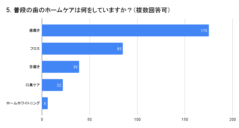ホームケアについては、ほとんどの回答者が「歯磨き」を挙げ、次点の「フロス」に約2倍の票差をつけました。