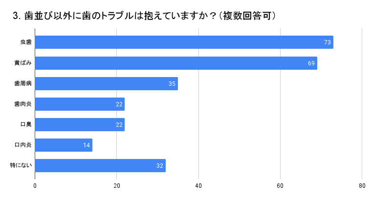 歯並び以外のトラブルでは、虫歯と黄ばみが70人前後と多く、一方で32人は「特にない」と答えました。