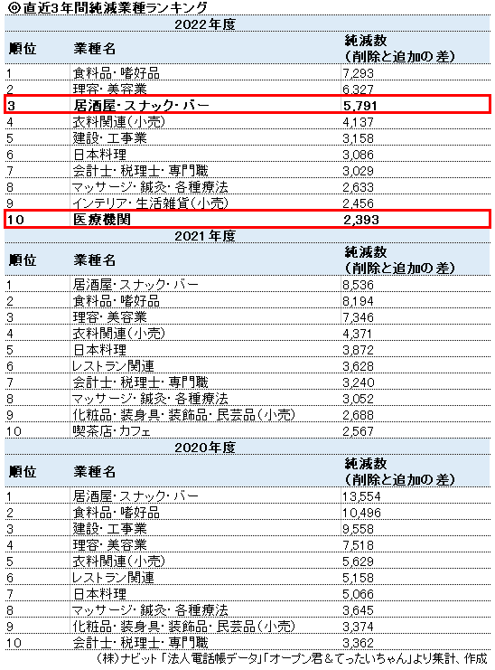 「医療機関」が新しくランキング入りしています。中でも歯科医院が減少傾向にあります。歯科医院は、院長の高齢化・後継者がいない・設備投資負担への維持継続の厳しさ・人手不足のような課題があることから減少していると思われます。