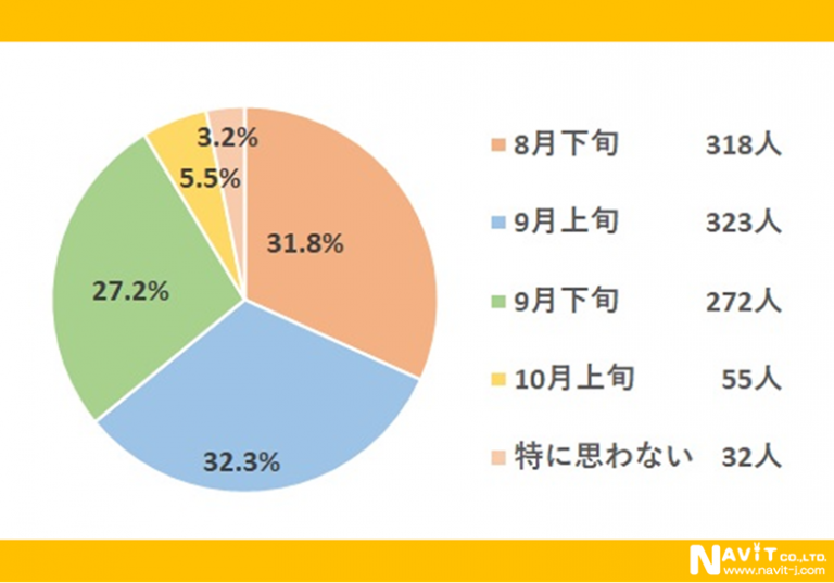 夏の終わりの時期については、かなり幅が広くて、「8月上旬」318人から「10月上旬」55人までと、かなりのバラツキがあります。感じ方は各人各様ということでしょうか。