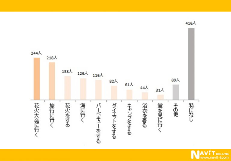 夏の間にやりたいことは「花火大会に行く」244人がトップ。コロナ禍で中止が続いたことから、今年の夏は久しぶりに全国各地で花火大会が開催され、賑わっていました。「旅行に行く」218人、「海に行く」126人なども同様ですね。
