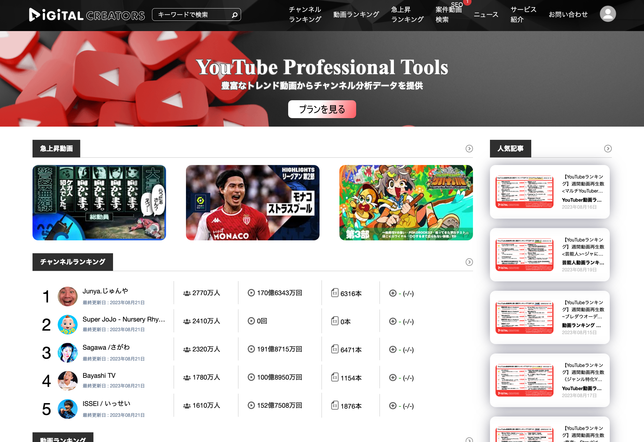 Digital Creatorsは、YouTubeの人気チャンネルや動画などのランキングデーターを無料でチェックできるサイトです。YouTube動画再生数ランキングは、週間ランキングや月間ランキングや年間ランキングなど期間別のランキングのほかに、ジャンル別ランキングなど、様々なデーターを公開していく予定です。
