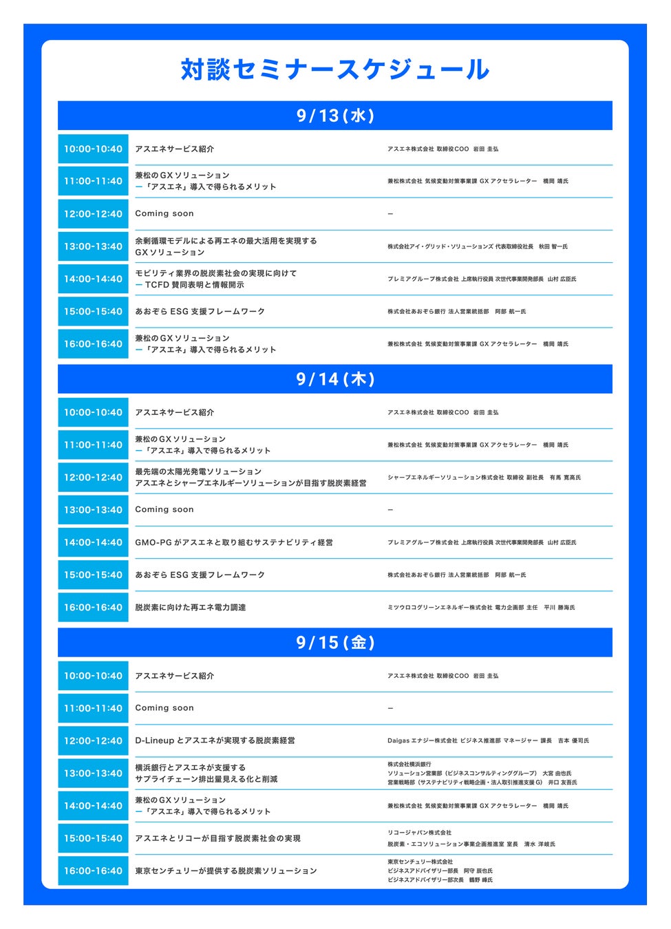 本展示会のブースではミニセミナーを行い、「アスエネ」や「アスエネESG」の製品情報や、脱炭素のワンストップソリューションについてなど、脱炭素・ESG経営のヒントとなりうる情報をご紹介します。自社のカーボンニュートラルやESG対策について課題を抱える企業のみなさまはぜひお越しください。