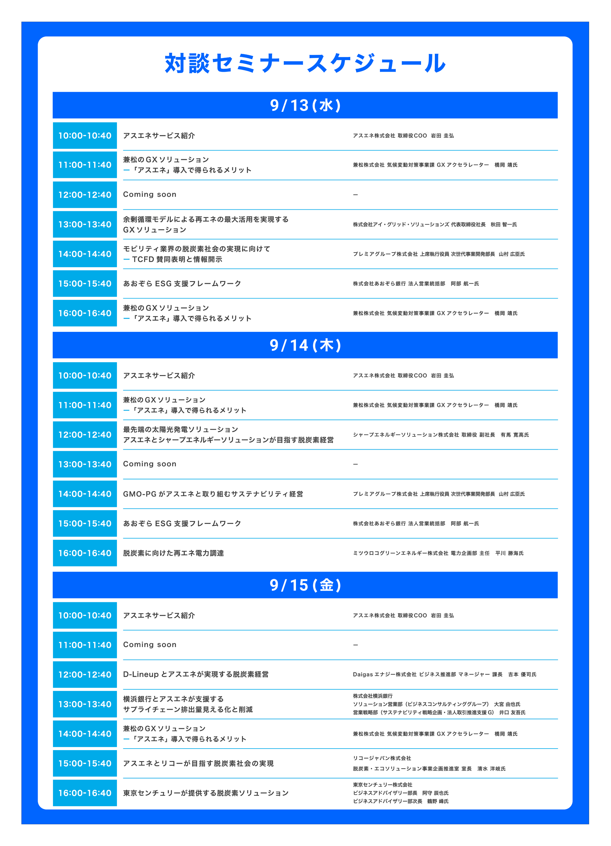 本展示会のブースではミニセミナーを行い、「アスエネ」や「アスエネESG」の製品情報や、脱炭素のワンストップソリューションについてなど、脱炭素・ESG経営のヒントとなりうる情報をご紹介します。自社のカーボンニュートラルやESG対策について課題を抱える企業のみなさまはぜひお越しください。