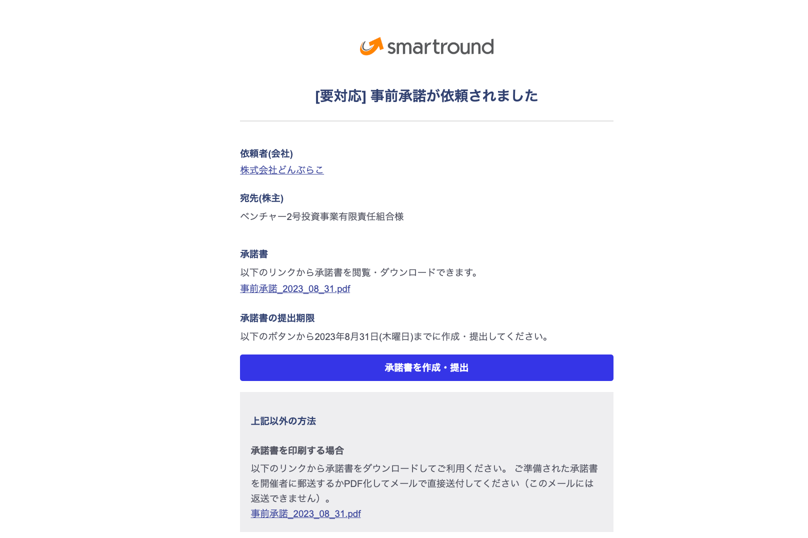 smartroundで送付した承諾依頼に対し、株主はオンラインで承諾書を提出できるので、回答する株主側の負担も軽減できます。