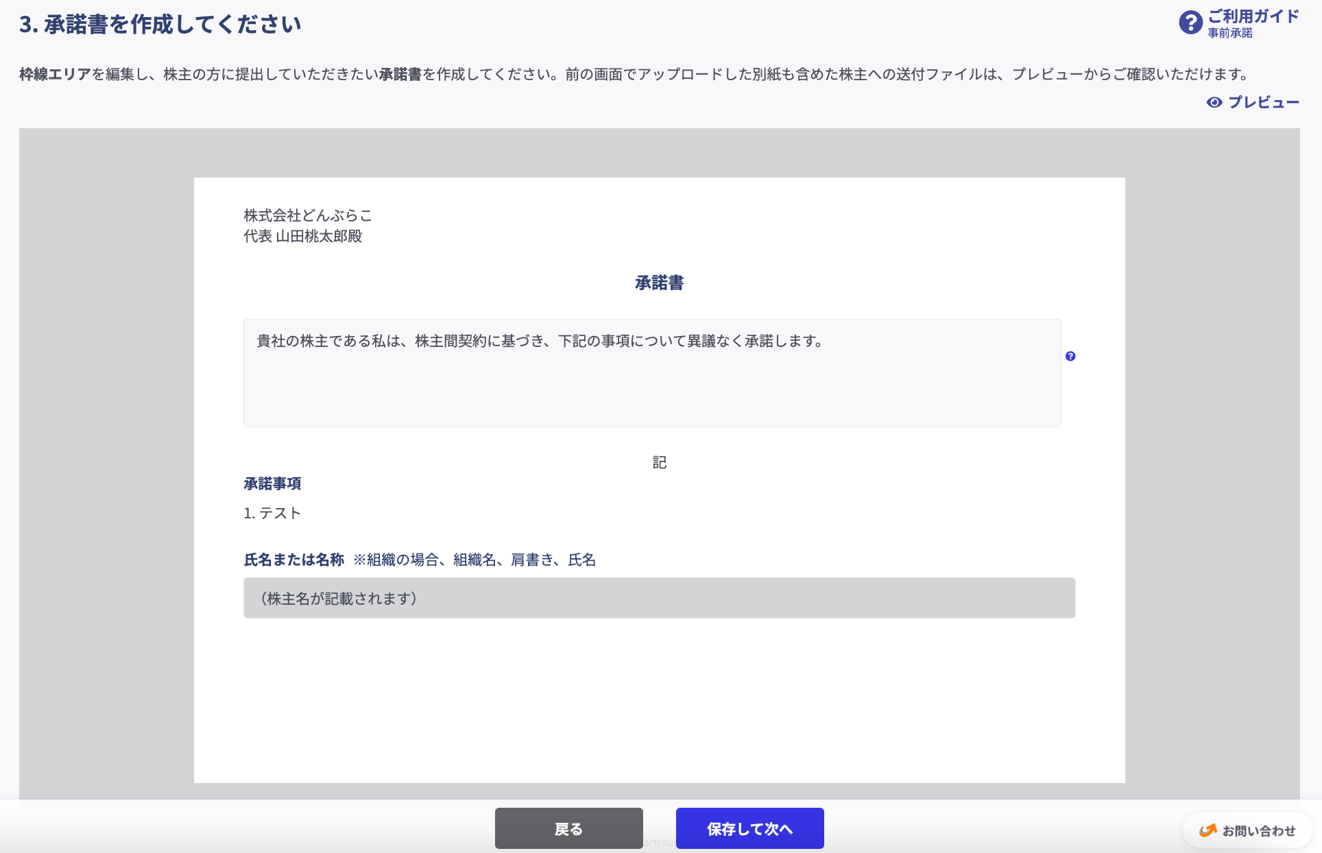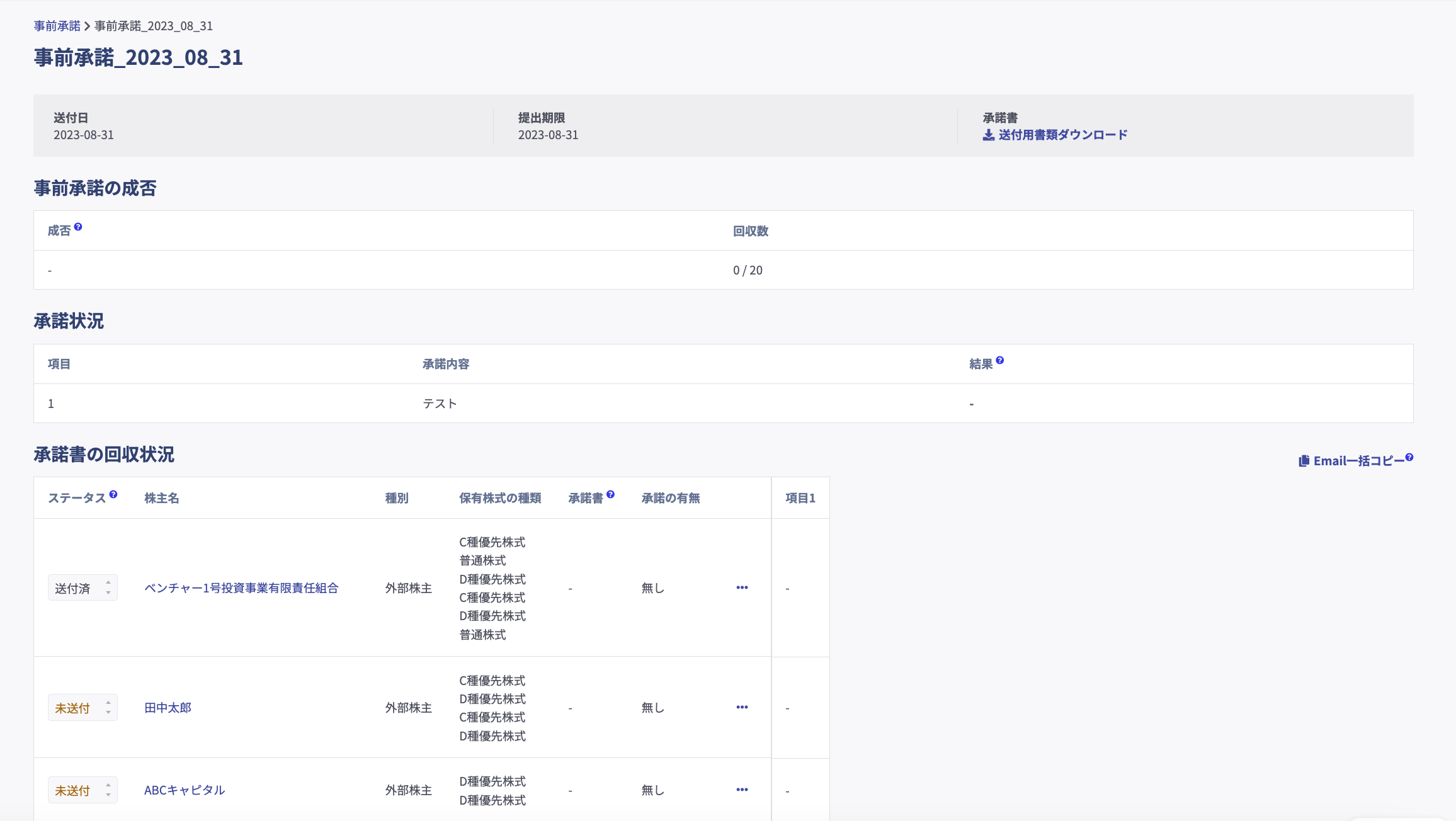 事前承諾機能は株主間契約や投資契約に基づく事前承諾事項の承諾書作成、発送、回収の一連の作業を自動化します。これまでの書面や電子契約ツールを利用して承諾を集める方法に比べ、事務作業の負担を大幅に軽減します。