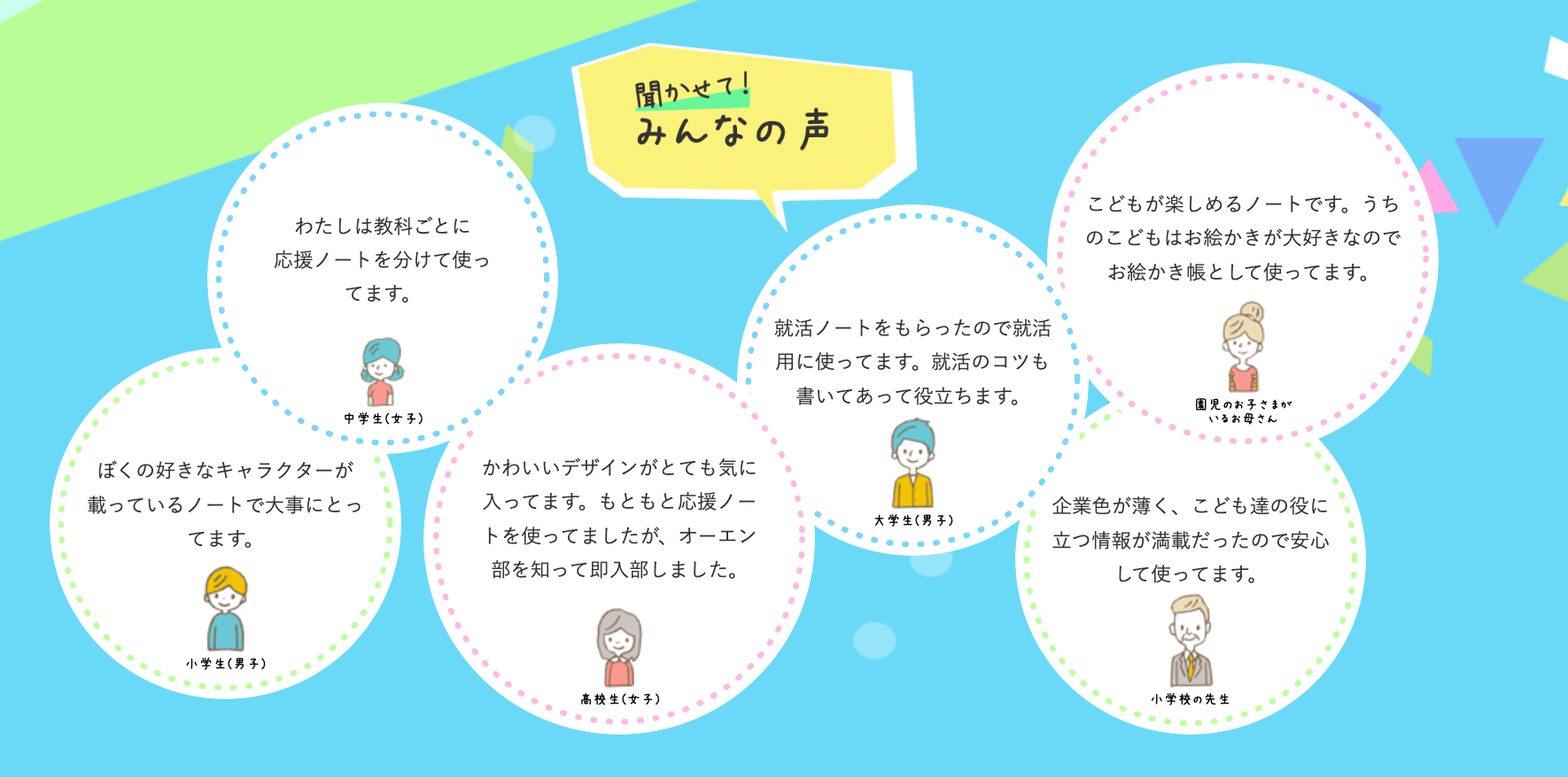 企業に協賛いただいて制作した「応援ノート」を子どもたちに無料で提供するサービスです。ノートがもらえるタイミングは入部時とリクエストを頂いた時(抽選)で、入部のきっかけは、学校にて応援ノートを配布された・お友達同士の口コミで知ったケースがほとんどです。応援ノートは表紙の裏・裏表紙の裏・バナー部分に企業広告を載せた学習ノートで、1社ずつオリジナルで制作し、各所に教育コンテンツを盛り込んでいるため子ども・保護者からも喜ばれるサービスになっています。