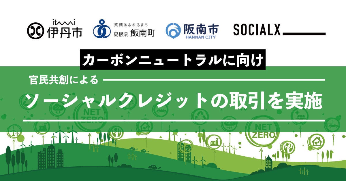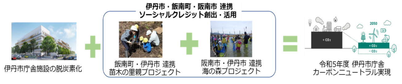 今般、その全国に先駆けた初めての事例として、伊丹市が飯南町・阪南市と共創したソーシャルクレジットを活用し、伊丹市庁舎のCO2排出量をオフセットすることで、カーボンニュートラルを実現しました。