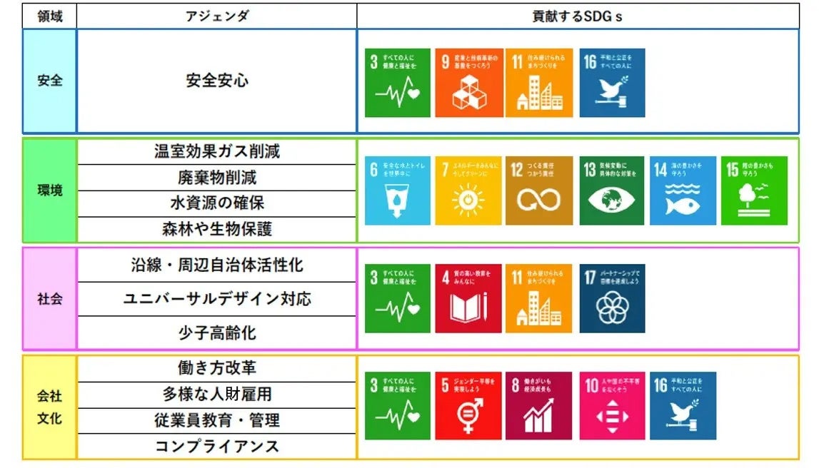これら環境、社会、ガバナンスなど一般的に「ESG活動」と呼ばれる活動を西武グループでは「サステナビリティアクション」と呼び、グループ全社において持続的な成長を遂げるため取り組んでいます。また、社会課題・事業環境等を踏まえて、特に取り組むべき4領域(安全、環境、社会、会社文化)、12アジェンダ(重要テーマ)を設定し、アジェンダに沿った取り組みを積極的に進めています。