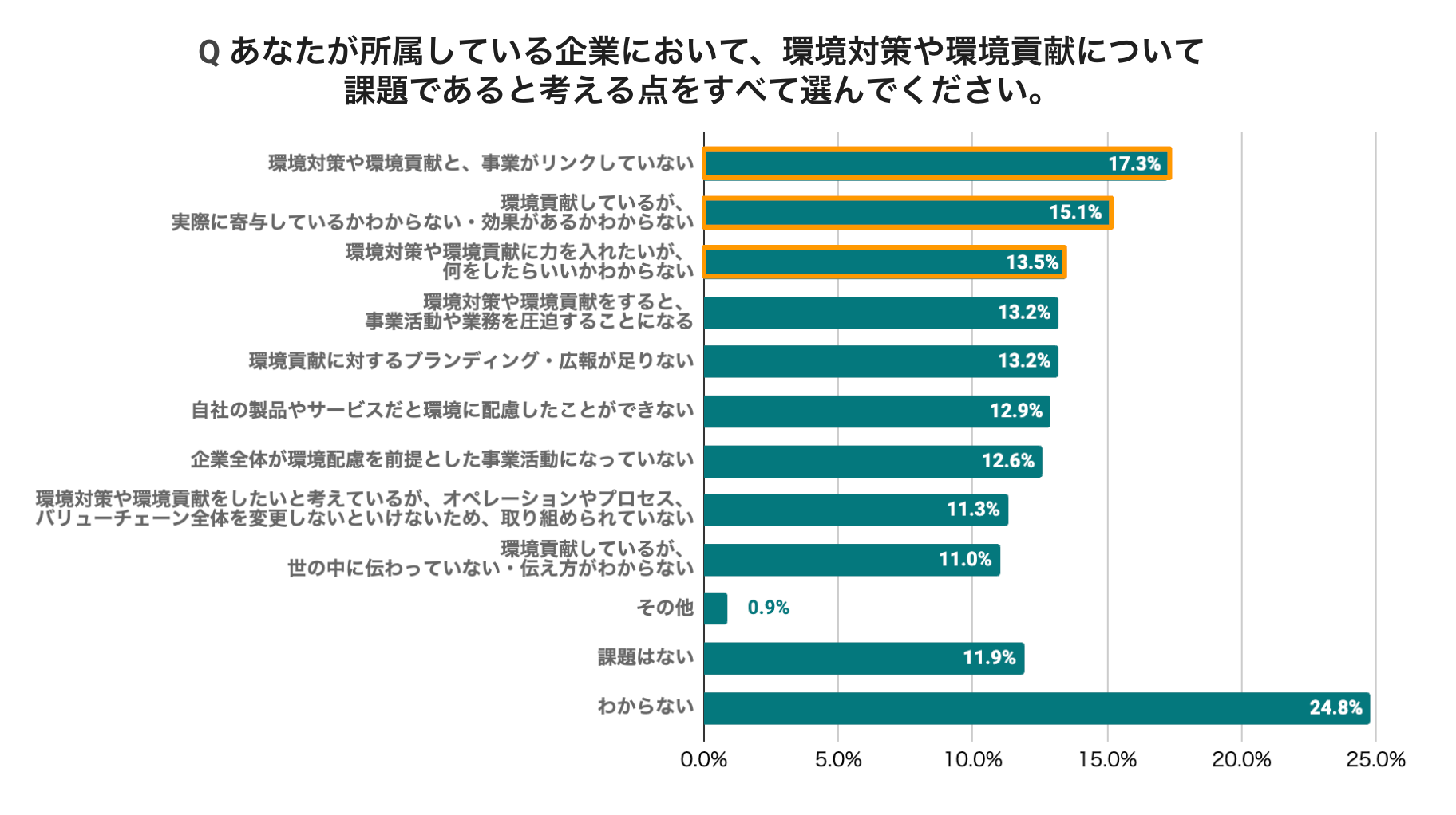 環境対策や環境貢献における自社の課題トップ3は「環境対策や環境貢献と、事業がリンクしていない」「実際に寄与しているか不明」「何をしたらいいかわからない」