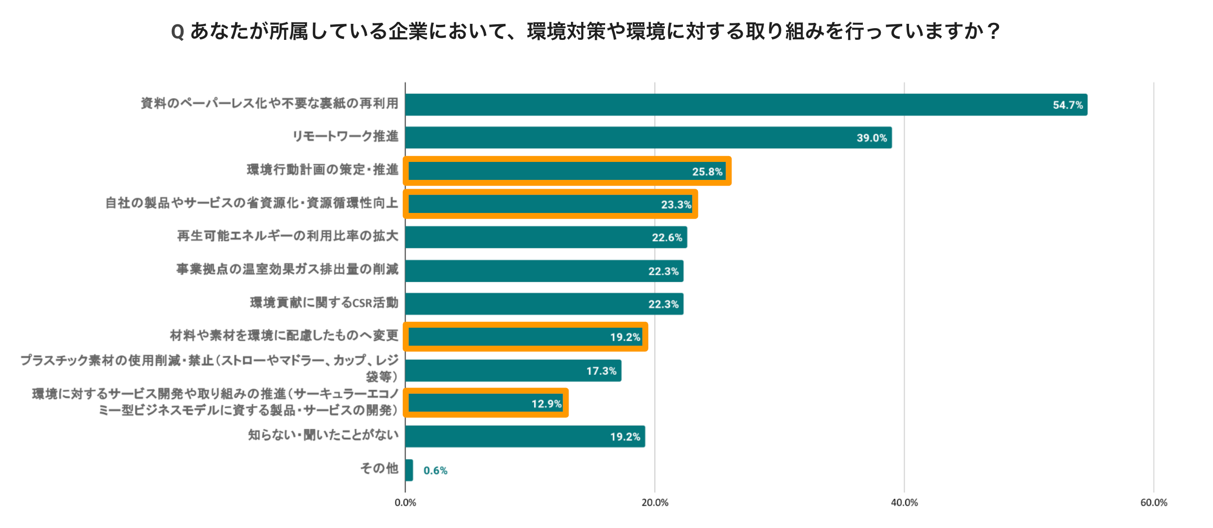 所属企業の環境対策や環境に対する取り組みについて聞いたところ、「資料のペーパーレス化や不要な裏紙の再利用」(54.7%)が最も多い回答となりました。一方で、具体的な環境対策である「環境行動計画の策定・推進」(25.8%)や「自社の製品やサービスの省電源化・資源循環性向上」(23.3%)、「材料や素材を環境に配慮したものへ変更」(19.2%)、「環境に対するサービス開発や取り組みの推進(サーキュラーエコノミー型ビジネスモデルに資する製品・サービスの開発)」(12.9%)について回答した比率は、いずれも3割未満にとどまっています。