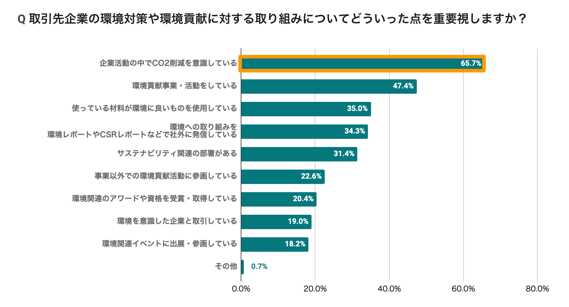 取引先業の環境対策や環境貢献に対する取り組みで重要視しているポイントについて聞いたところ、およそ3人に2人(65.7%)が「企業活動の中でCO2削減を意識している」と回答しました。