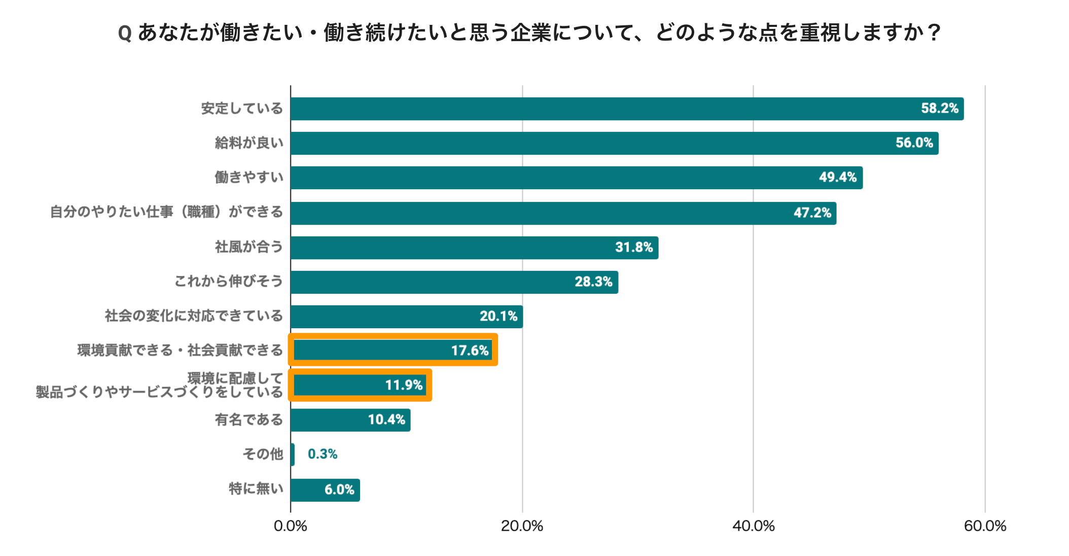 働きたい・働き続けたいと思う企業について、重要である点を聞いたところ、「安定している」(58.2%)や「給料が高い」(56.0%)が半数以上の方が回答しました。一方で、「環境貢献できる・社会貢献できる」(17.6%)や「環境に配慮して製品づくりやサービスづくりをしている」(11.9%)と回答した方は2割未満にとどまるなど、就職や転職において、環境貢献に対する意識はまだ成熟していないことがわかります。