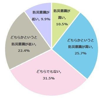 子どもの防災意識についてどのように感じるか質問したところ、36.2%が「防災意識が高い」(防災意識が高い:10.5%、どちらかというと防災意識が高い:25.7%)、32.3%が「防災意識が低い」(防災意識が低い:9.9%、どちらかというと防災意識が低い:22.4%)、31.5%が「どちらでもない」と回答しました。